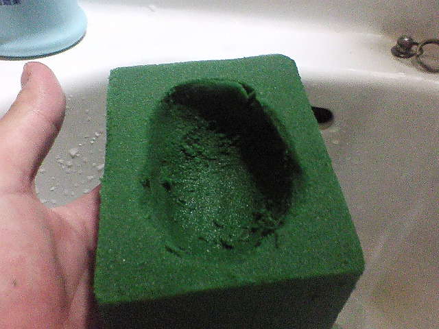作り方として、まず100円均一で売っている(ダイ○ーとかならまずうってますね)オアシスを購入。適当な大きさに切ったあとに水を含ませ、楕円形の円をえがきます。