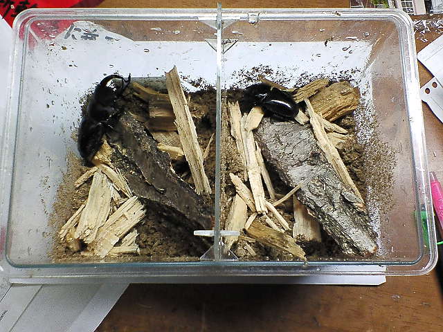 まず恐る恐るふたを開けてみて(コバシャですよ?)材を取り出しました。もうその段階で雌雄が確認できたのでクワガタも取り出し、あとはためらいつつもケースをひっくり返してGを逃がしてやります。