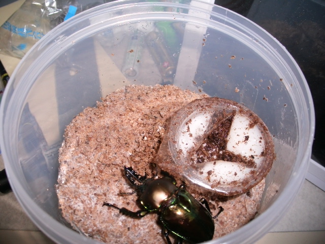 こんな感じ。事前に数日間同居させていたせいか、メスは既に菌糸にもぐっております。今回はうまくいきそうかも♪