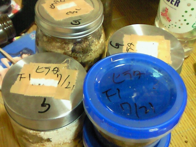 左手前のビンの茶色いところはオオクワメスの蛹室があったところです(汗