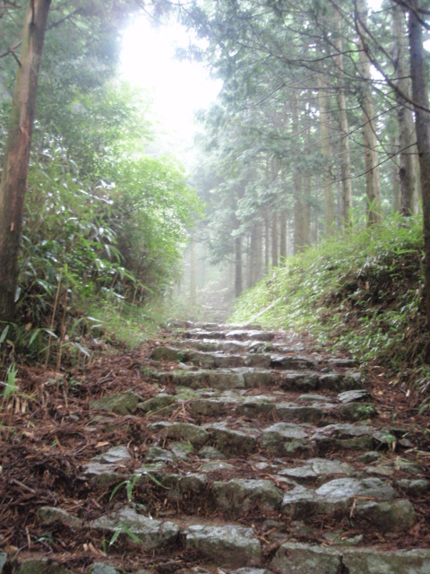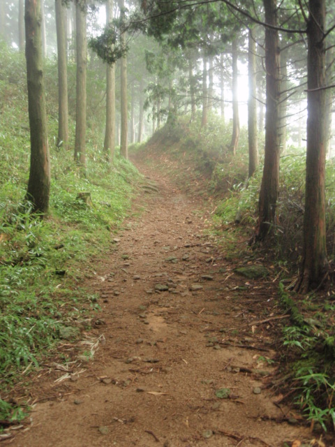 その後は古道を歩きました・・・が、ここらで本降りになってきてしまい、正直怖かったです。だってすぐ隣は崖ですし、コロコロと上から意思が降ってきているし・・・