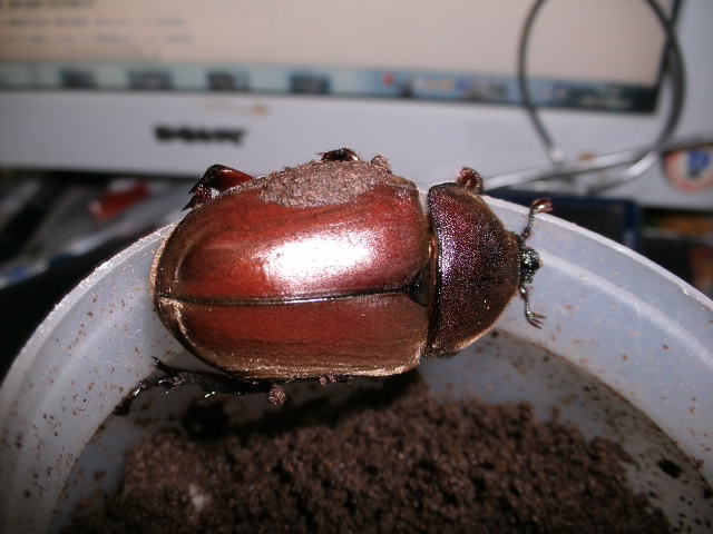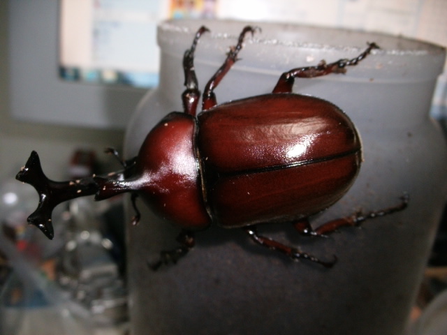 何でかわかりませんが、メスと同じような時期に早熟で羽化してしまった個体で小型です。早熟と言っても、今年は♂がこいつしかおりませんので、比較して早いとか遅いとか言えるわけではないんですけどね。