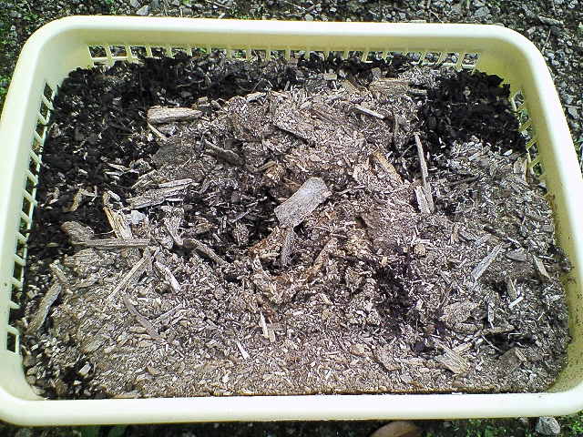 上記写真が飼育ケース。排水がスムーズに行くようなやつですね。使用しているマットは腐葉土とリサイクルマットです。