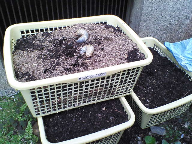 写真で見ての通り、洗濯籠(大)三つに幼虫を投入しています。この場所は一日中日陰の場所で、昔からカブト(成虫)の虫かご置き場になってました。通常時は端に移っているブルーシートをかけてます。
