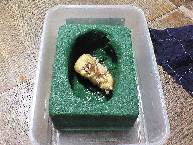 そのあとにそれをガイドとしてスプーンなどで掘り進みます。簡単に彫れてしまうので注意してください。ある程度形が出来たらあとは指の腹で整えてあげれば完成です。そっと蛹を移して上げましょう。ここは全神経を集中させましょう(笑
