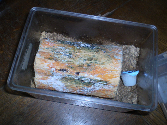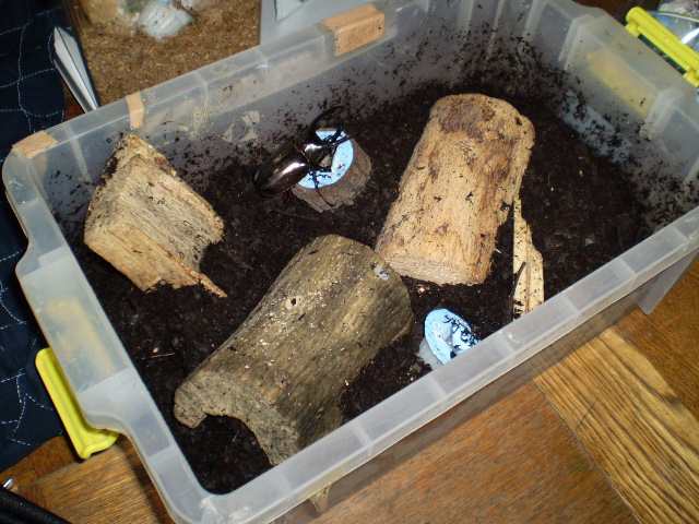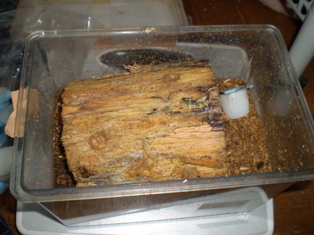 飼育状況→ケース(小型の衣装ケース・・・のようなもの)マット(セキチューで買った激安腐葉土198円)えさ(オオクワと共用。プロゼリー)止まり木(オオクワの産卵木の残骸w)